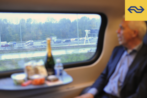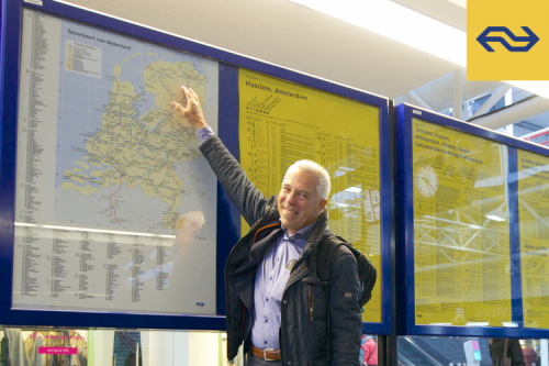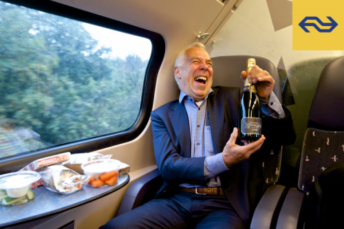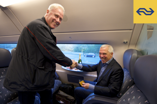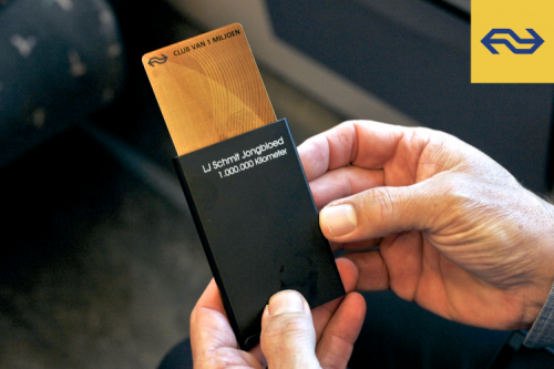 Lodewijk Schmit Jongbloed reist al 25 jaar met de trein en berekende dat hij 1 miljoen kilometer heeft afgelegd met NS. Per jaar reist hij gemiddeld 40.000 kilometer per spoor. We verrasten hem met een lunch en een bedankje in de vorm van een speciaal voor hem ontworpen gouden kaartje.