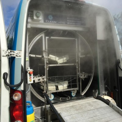 Eens per week rijdt een bus van CleanCarts naar de NS-servicelocatie in Zwolle. Aan de buitenkant is het een gewone bestelbus, maar van binnen herbergt de bus een complete mobiele vaatwasser. Normaliter bedoeld voor het reinigen van winkelwagentjes en -mandjes. Tot een NS-medewerker bedacht dat dit ook handig zou kunnen zijn voor het schoonmaken van treinafvalbakken.